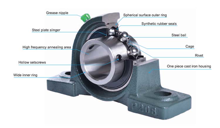এই ইউনিটগুলি একটি রেডিয়াল বল বিয়ারিংস, সিল এবং উচ্চ গ্রেড কাস্ট লোহা বা চাপযুক্ত স্টিলের একটি আবাসন যা বিভিন্ন আকারে আসে। ম্যাচিং ভারবহন এবং আবাসনের অভ্যন্তরীণ পৃষ্ঠের বাইরের পৃষ্ঠটি গোলাকার হয় যাতে ইউনিটটি স্ব -প্রান্তিককরণ হয়।